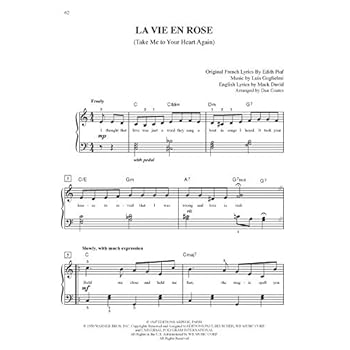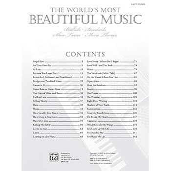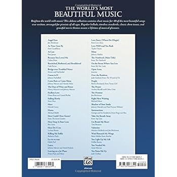 Brighten the world with music! For pianists of all ages, this deluxe collection contains sheet music for 40 of the most beautiful songs ever written. Popular ballads, timeless standards, classic show tunes and graceful movie themes assure a lifetime of musical pleasure. Titles: Angel Eyes (Jim Brickman) * As Time Goes By (from Casablanca) * At Last (Etta James) * Because You Loved Me (Celine Dion) * Bewitched, Bothered and Bewildered (Cole Porter) * Bridge over Troubled Water (Simon and Garfunkel) * Canon in D (Pachelbel) * Come Rain or Come Shine * Days of Wine and Roses * Endless Love (Diana Ross and Lionel Richie) * Falling Slowly (from Once) * Hero (Mariah Carey) * Home (Michael Bublé) * How Could I Ever Know? (from The Secret Garden) * How Deep Is Your Love (Bee Gees) * How Do I Live (LeAnn Rimes) * Killing Me Softly with His Song (Roberta Flack) * La Vie en Rose (Edith Piaf) * Laura (Johnny Mercer) * Leaving on a Jet Plane (Peter, Paul, and Mary) * Love Story (Where Do I Begin) * Love Will Lead You Back (Taylor Dayne) * Misty (Johnny Mathis) * The Notebook (from The Notebook) * On the Street Where You Live (Lerner/Loewe) * Open Arms (Journey) * Over the Rainbow (Judy Garland) * People (Barbra Streisand) * The Prayer (Andrea Bocelli and Celine Dion) * The Promise (Jim Brickman) * Right Here Waiting (Richard Marx) * The Shadow of Your Smile (Mandel/Webster) * Summertime (Gershwins) * Take My Breath Away (from Top Gun) * Un-Break My Heart (Toni Braxton) * Valentine (Martina McBride and Jim Brickman) * Wind Beneath My Wings (Bette Midler) * You Light Up My Life (Debby Boone) * You Needed Me (Anne Murray) * You Raise Me Up (Josh Groban).